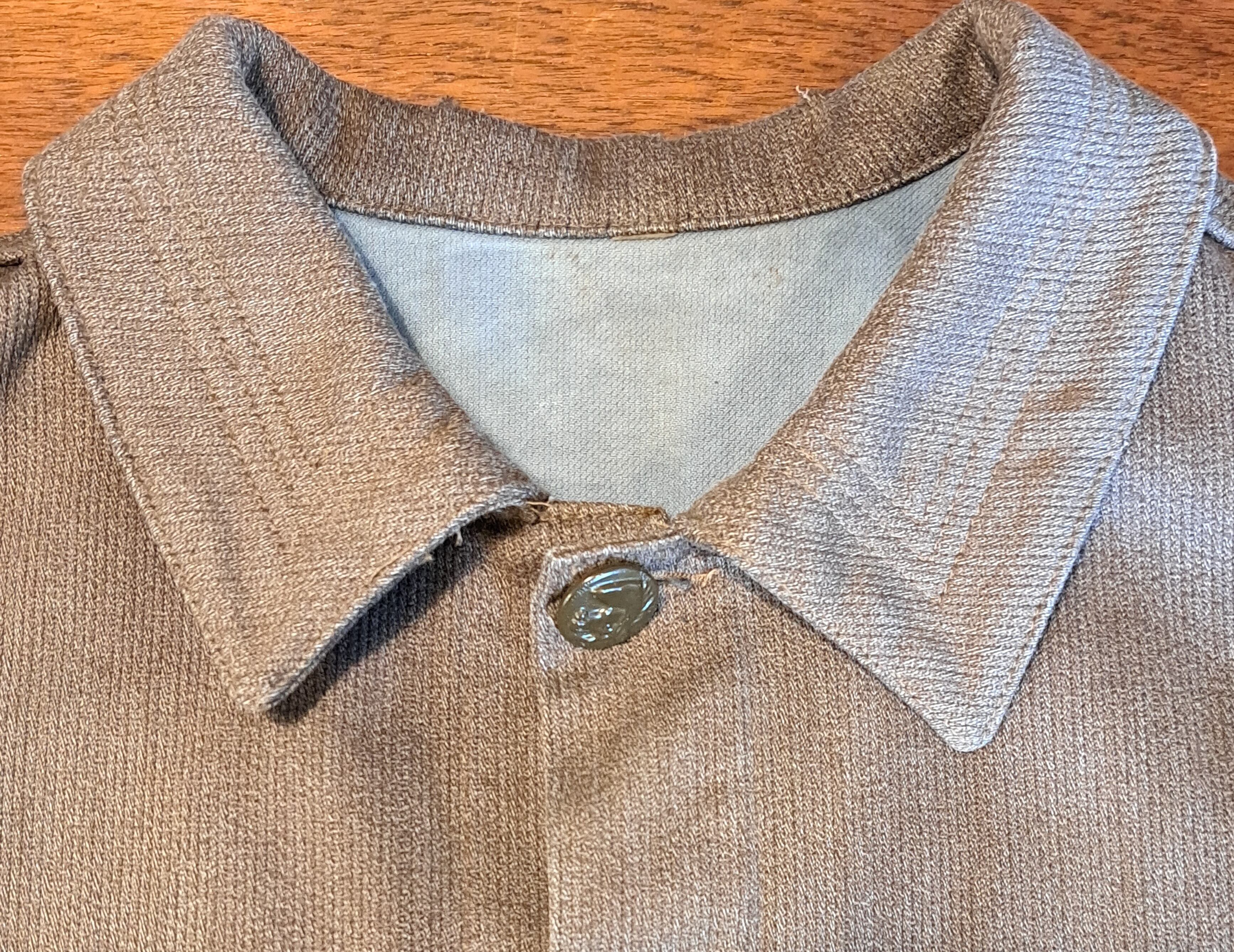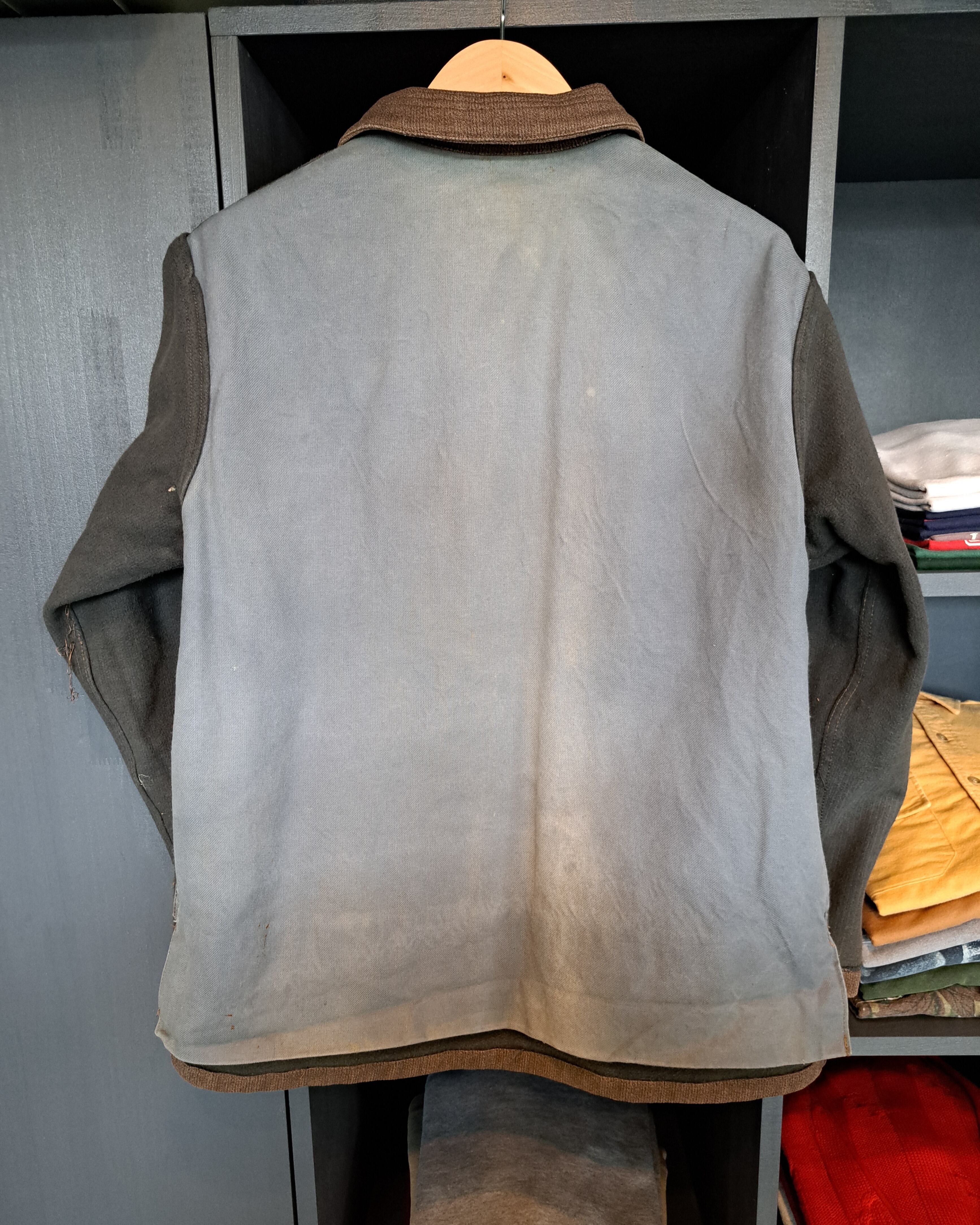 狩猟以外に普段着としても着用されていたハンティングジャケットになります。ブラウン系のピケ生地となりフェードが見られます。背面にはゲームポケットも装備され、襟はステッチ、ボタンは動物ボタンになります。