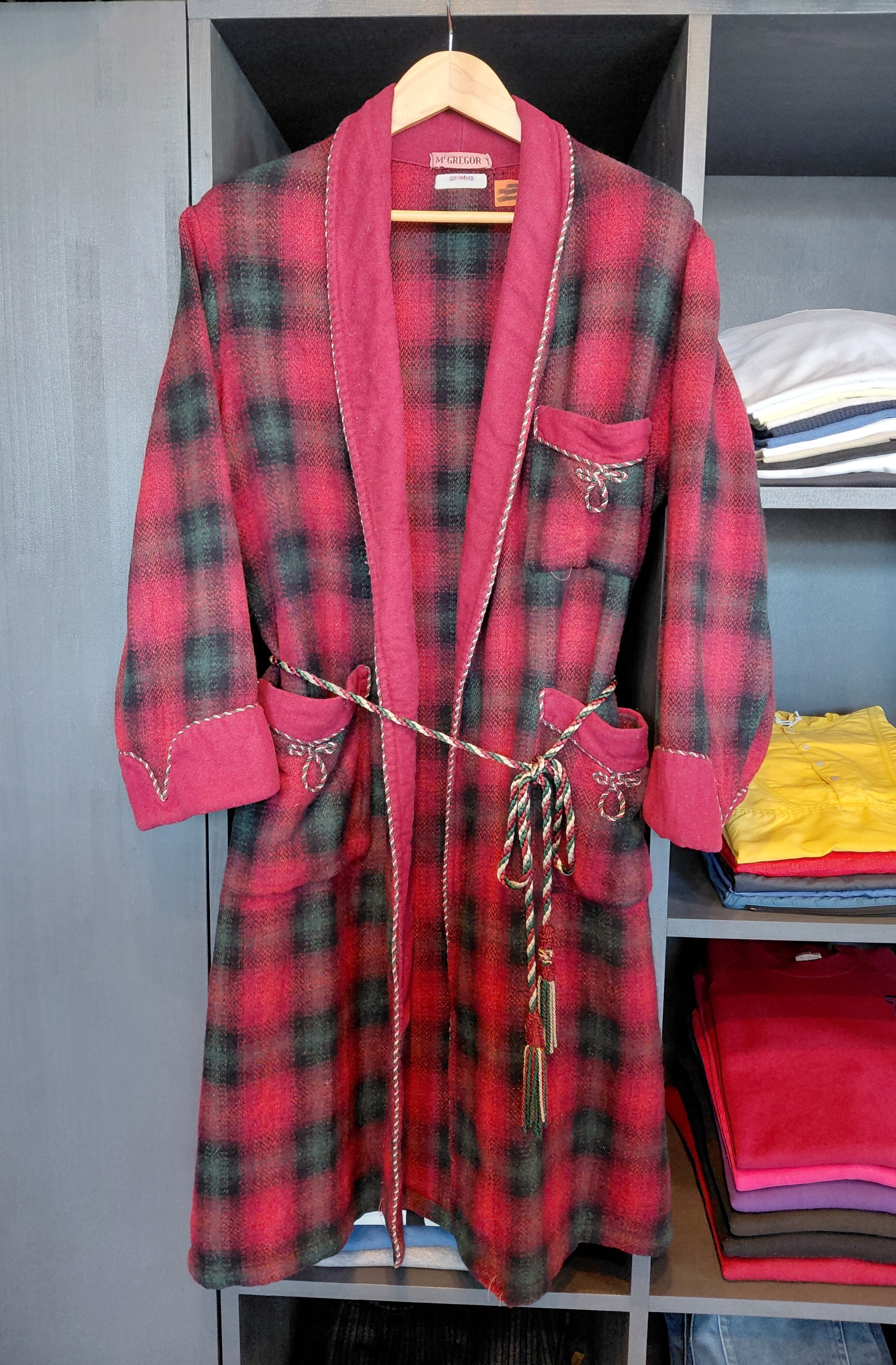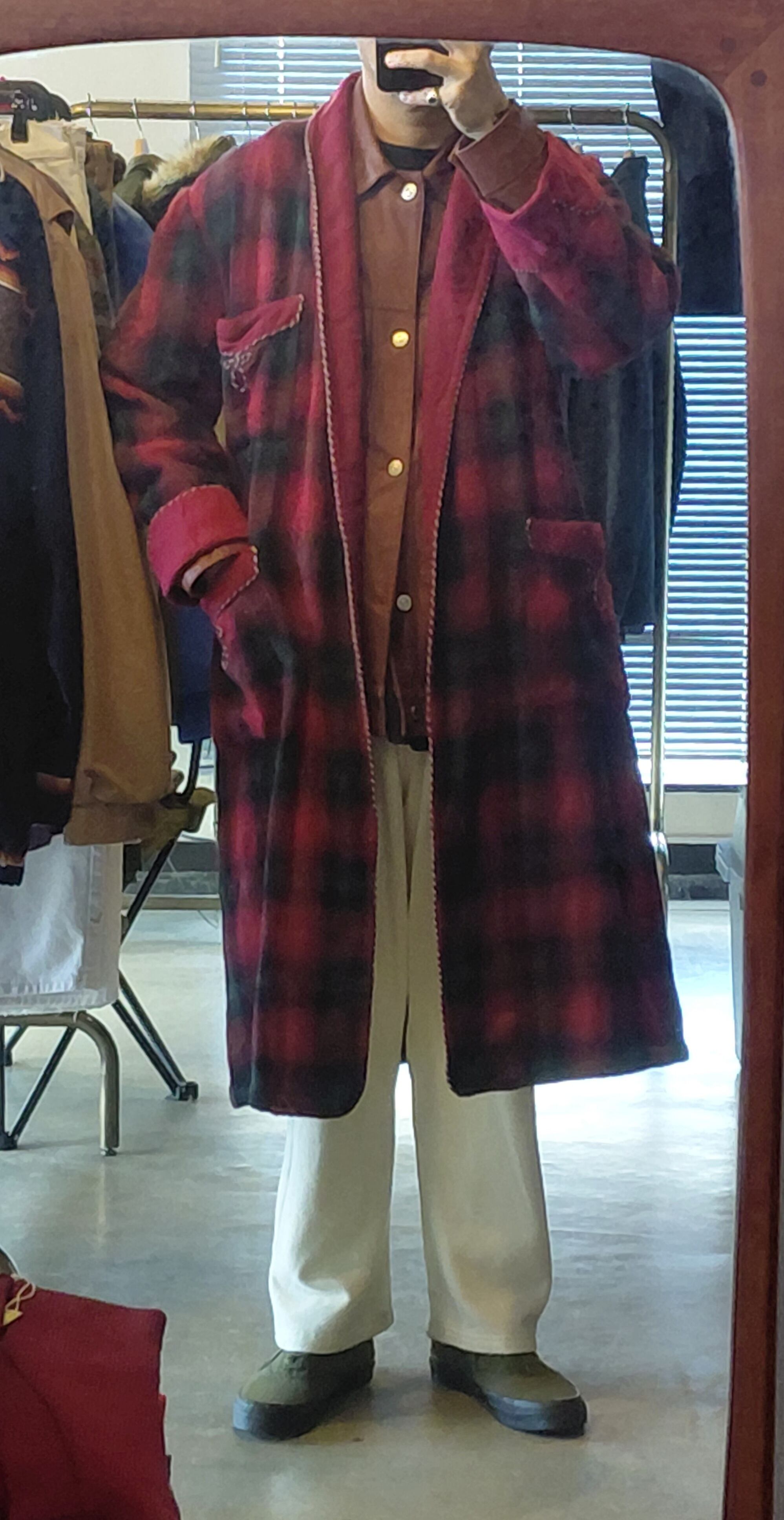 60年代のマクレガーチェックウールガウン、温かみのあるチェック柄が特徴の一品です。襟周りにはダメージがありますが、ウールフランネルの風合いは十分に楽しめる状態で、ヴィンテージテイストを存分に引き立てています。ウエスト紐は欠損がなく、着こなしの幅を広げるアクセントになるでしょう。