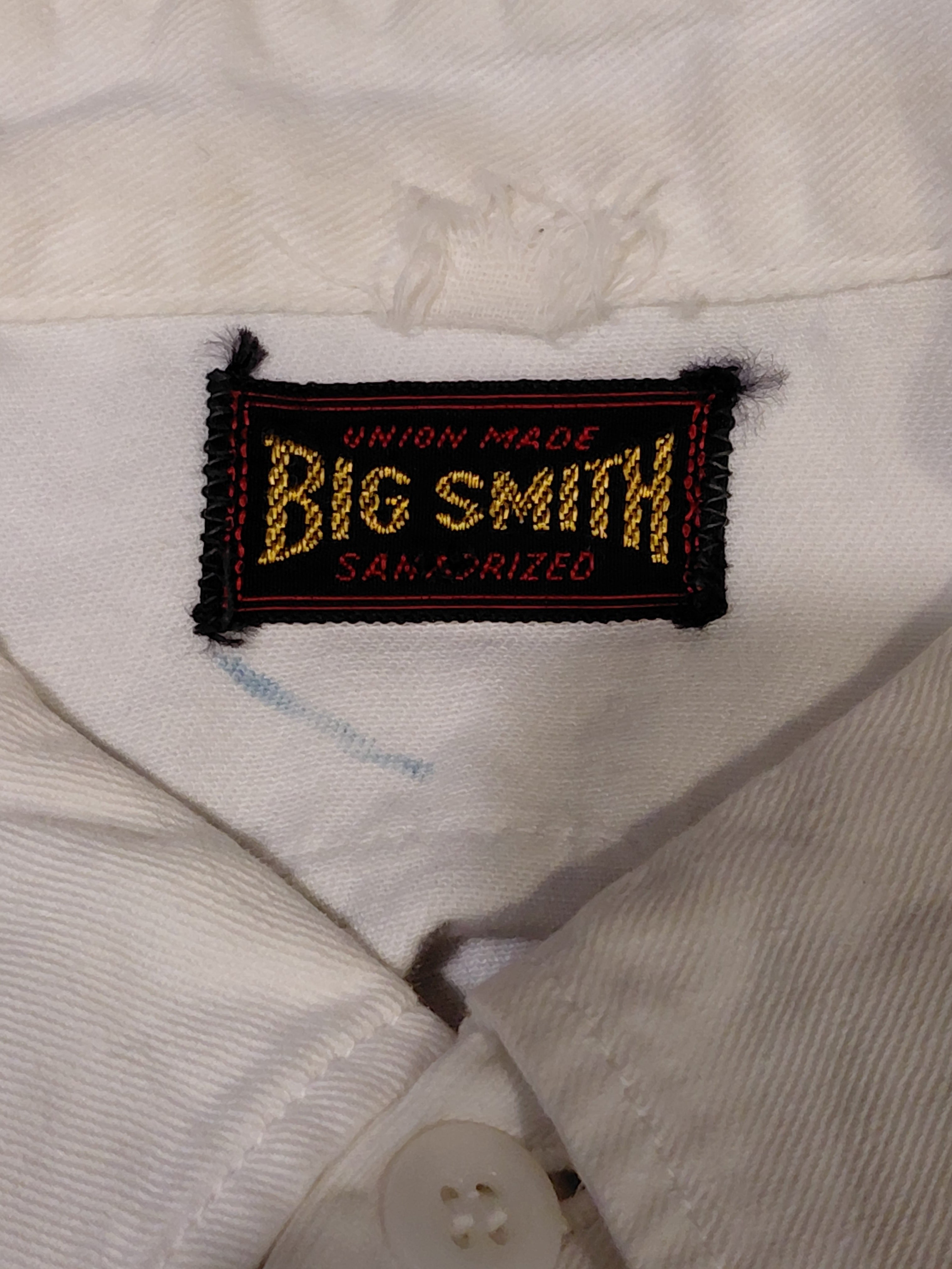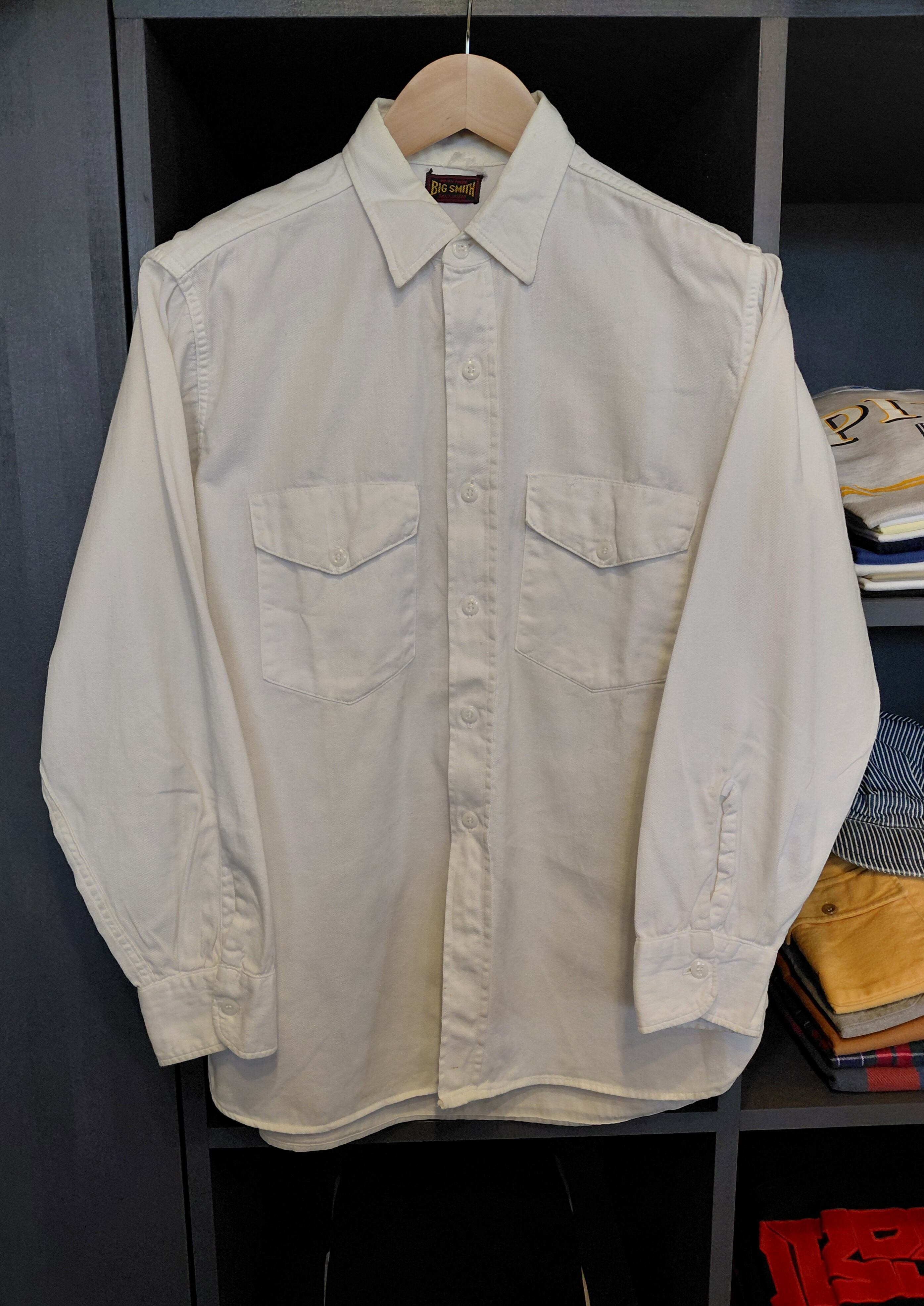 50年代のBIG SMITHワークシャツ、ヴィンテージならではの存在感が魅力の一品です。珍しい白色の生地は、ビンテージスタイルを求める方にぴったり。襟に汚れは見られますが、生地はしっかりとしており、長くご愛用いただけること間違いなしです。マチ付きのペン刺しや独自のビンテージディティールもポイントで、他にはない個性的なスタイルを演出します。