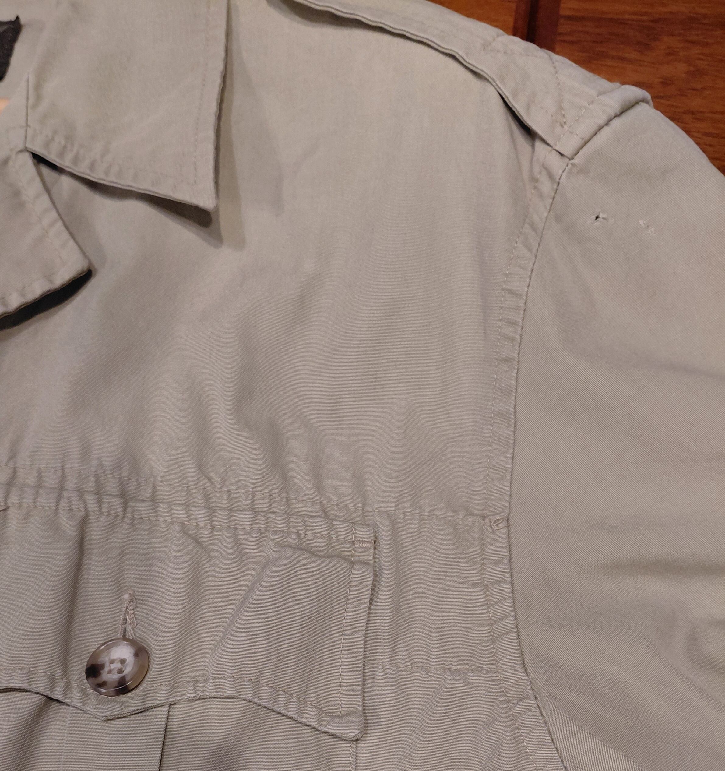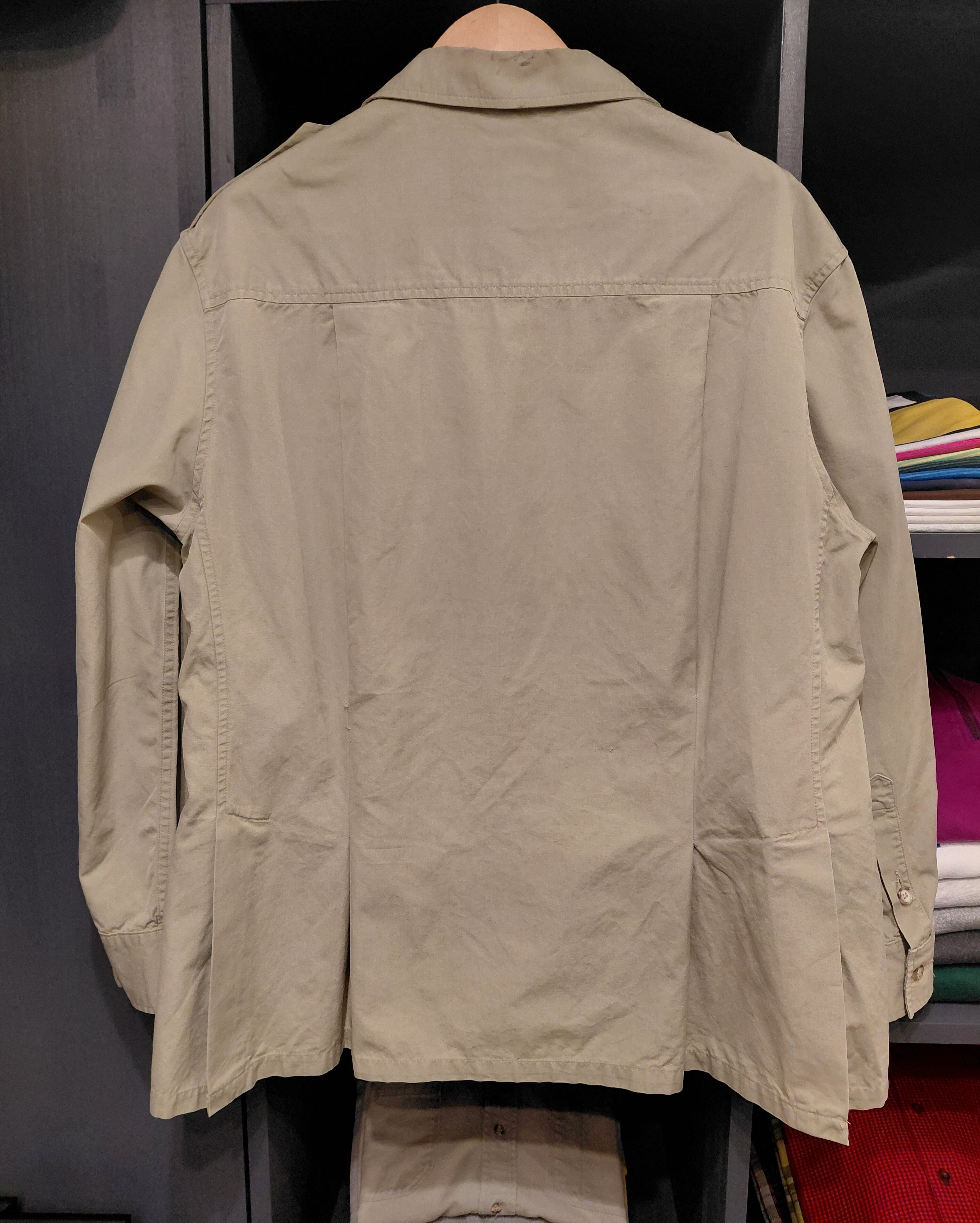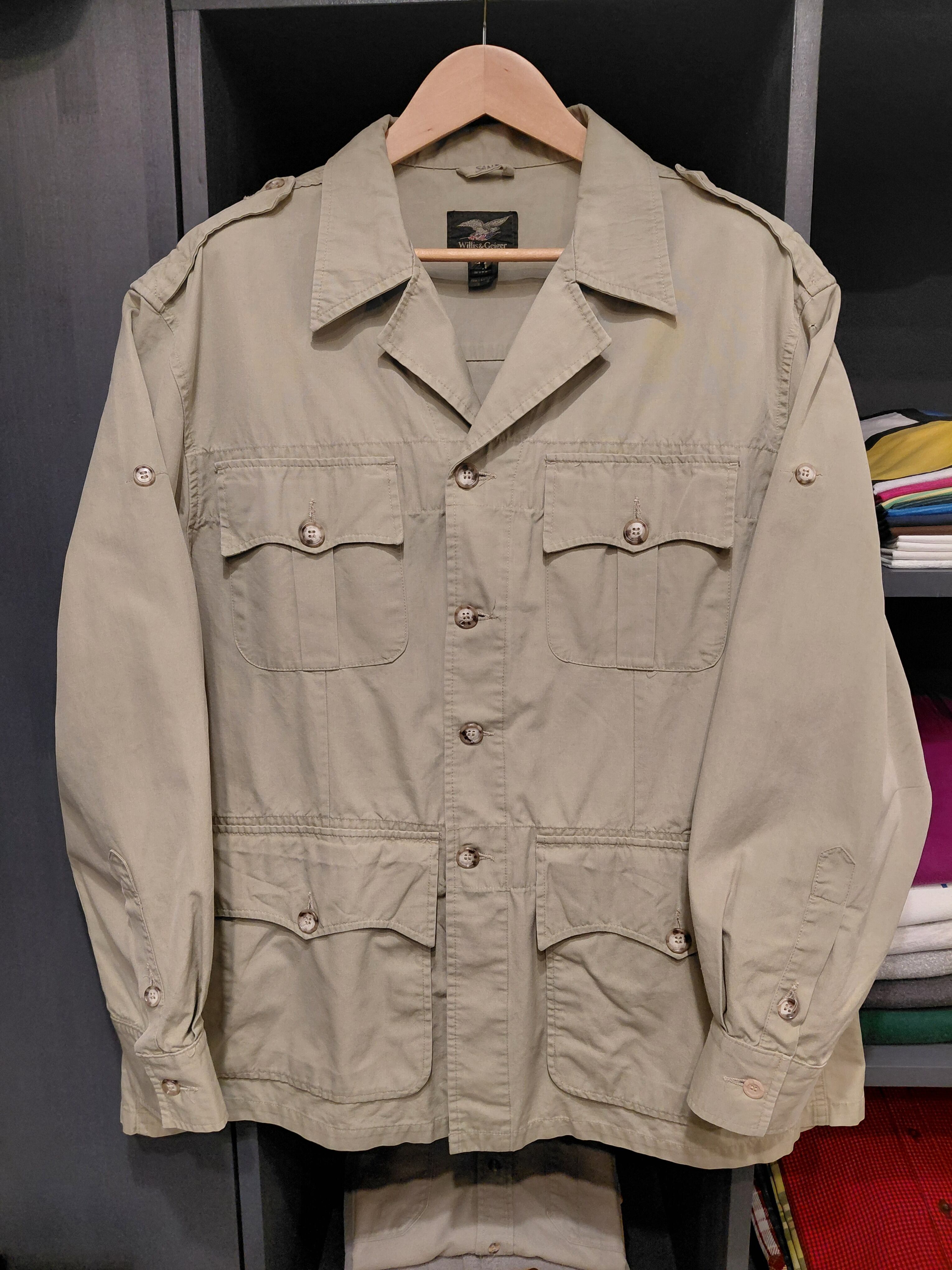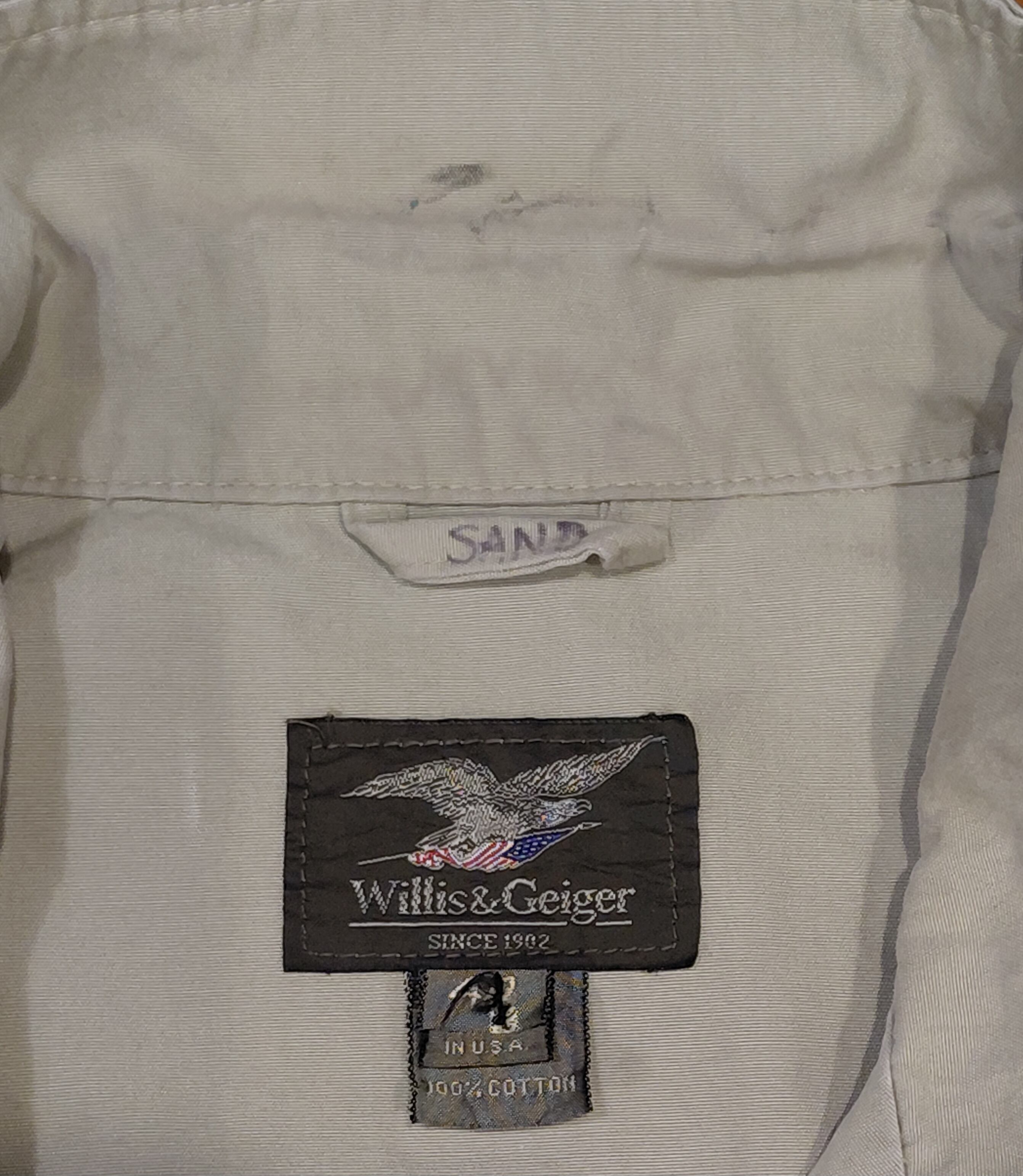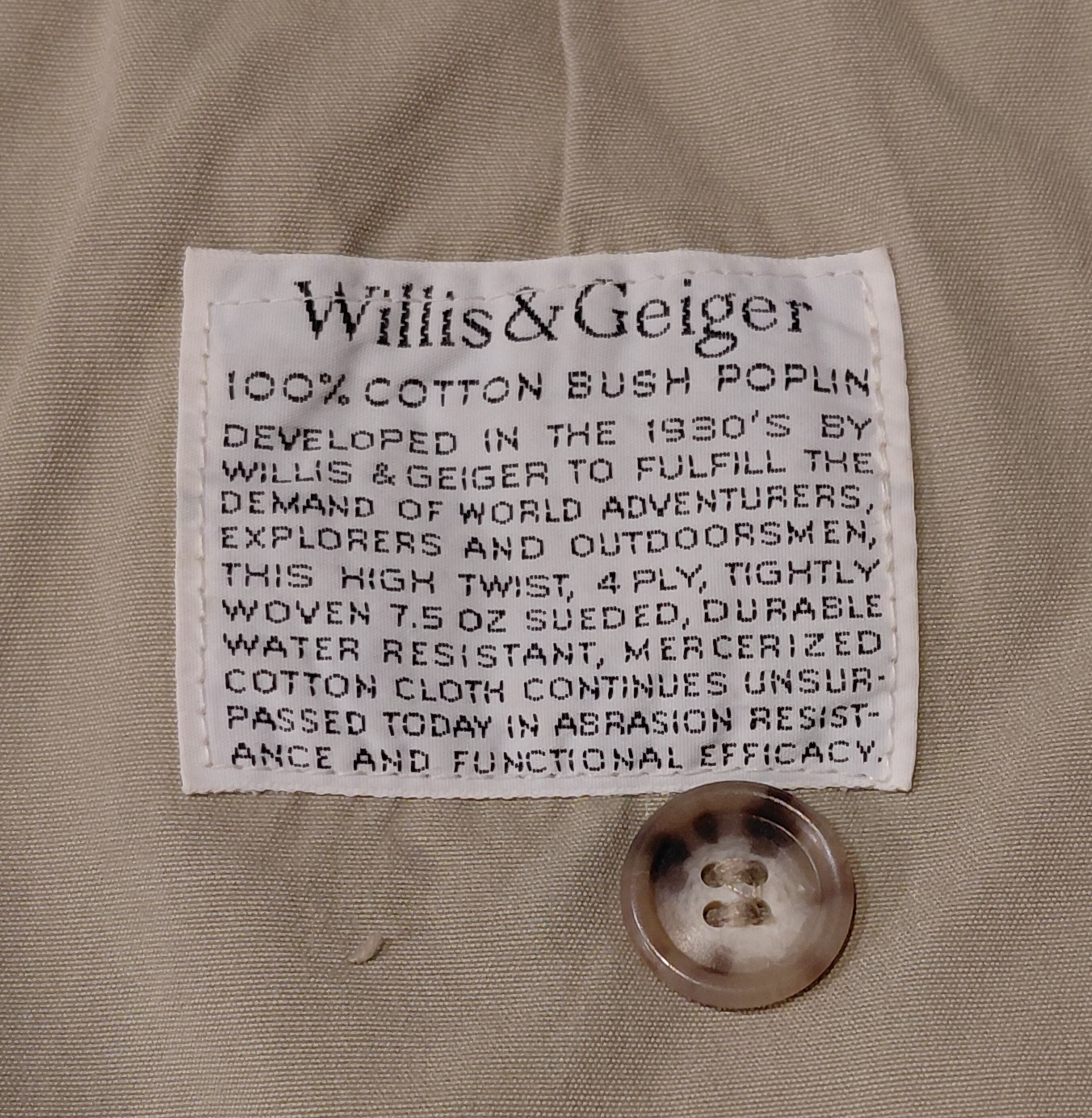 80年代から90年代にかけてのWillis&Geiger製ジャケットは、アメリカ製の高品質なアイテムです。このジャケットは、ブッシュポプリンという張りのある生地が特徴で、長年の使用にも耐える丈夫さを持っています。所々にはホールや汚れが見受けられますが、生地自体はしっかりしており、ヴィンテージならではの風合いを楽しむことができます。